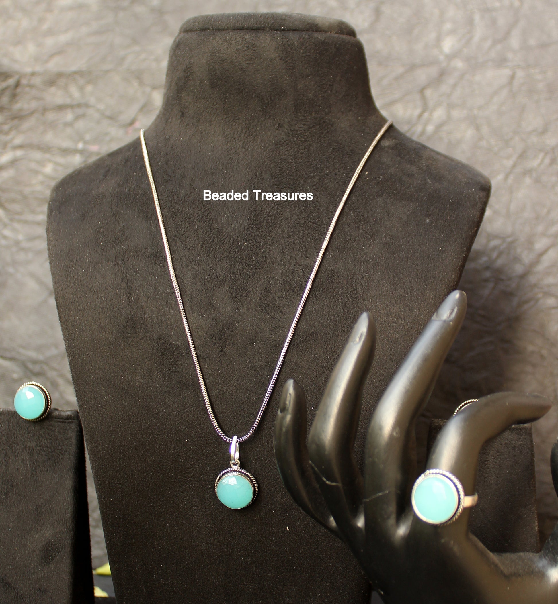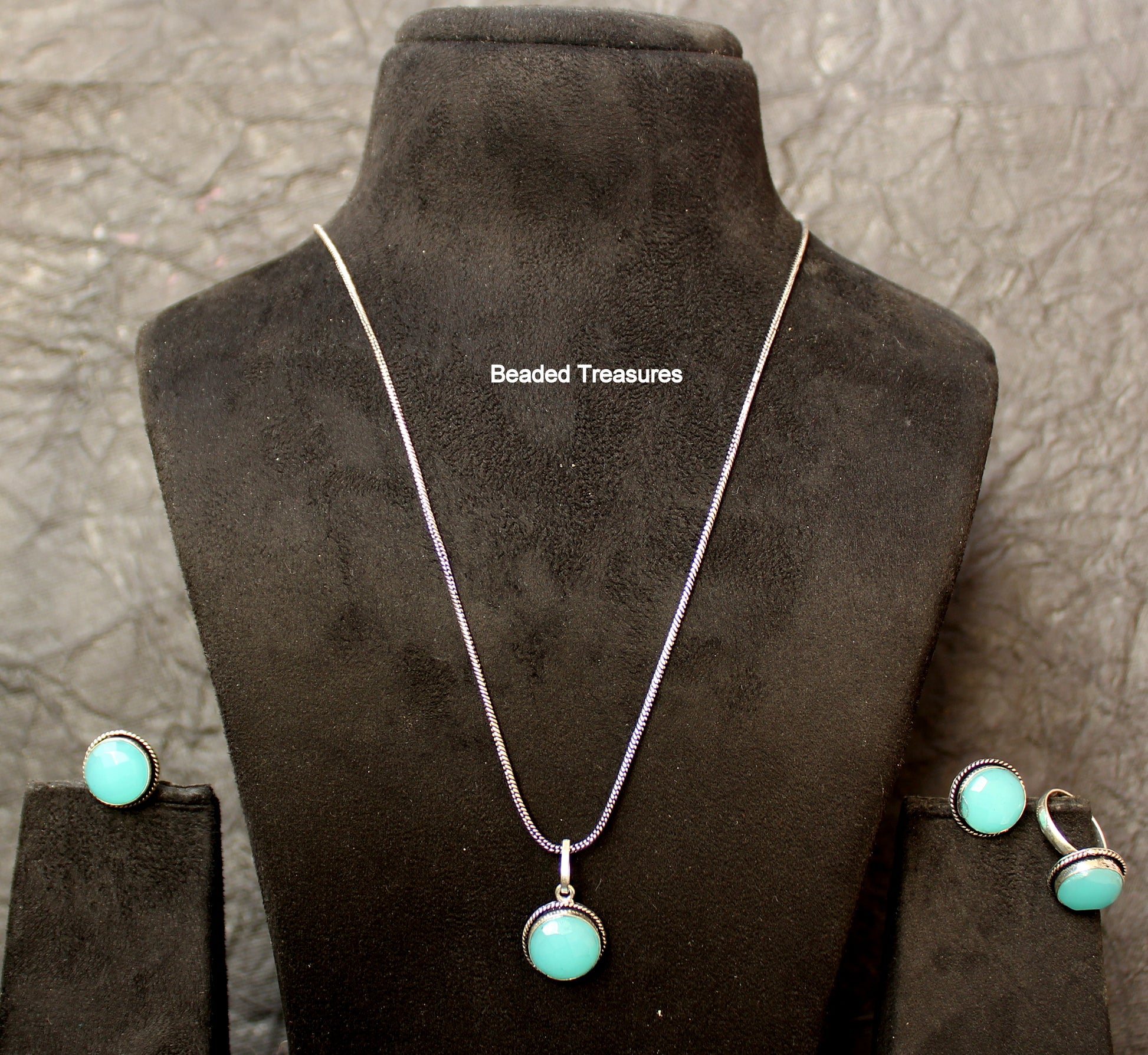 - Elegant and soothing Necklace Set featuring genuine or simulated larimar stones set in a beautiful sterling silver frame, including a pendant necklace, stud earrings, and an adjustable ring, handcrafted by Beaded Treasures in Bengaluru.
