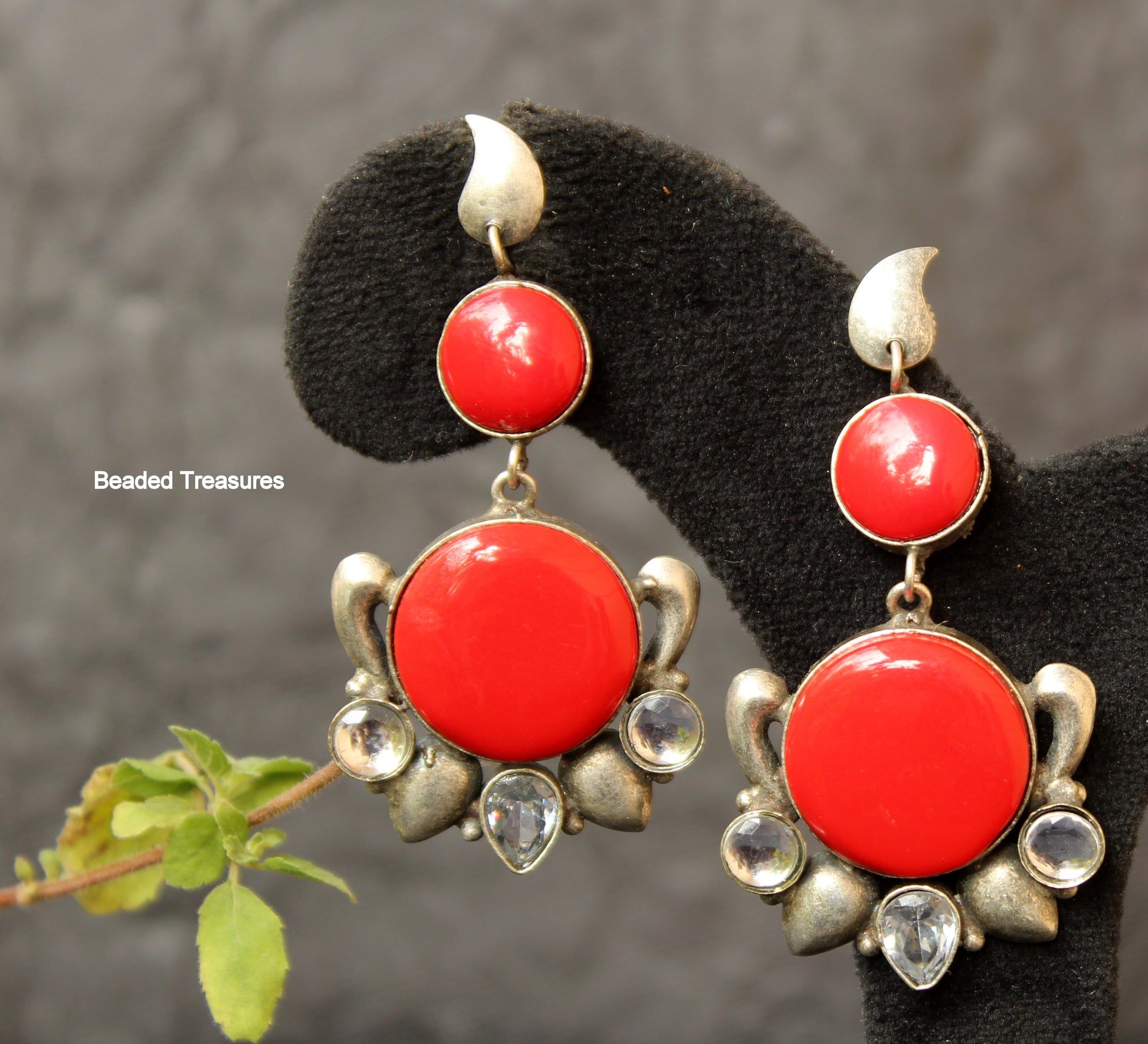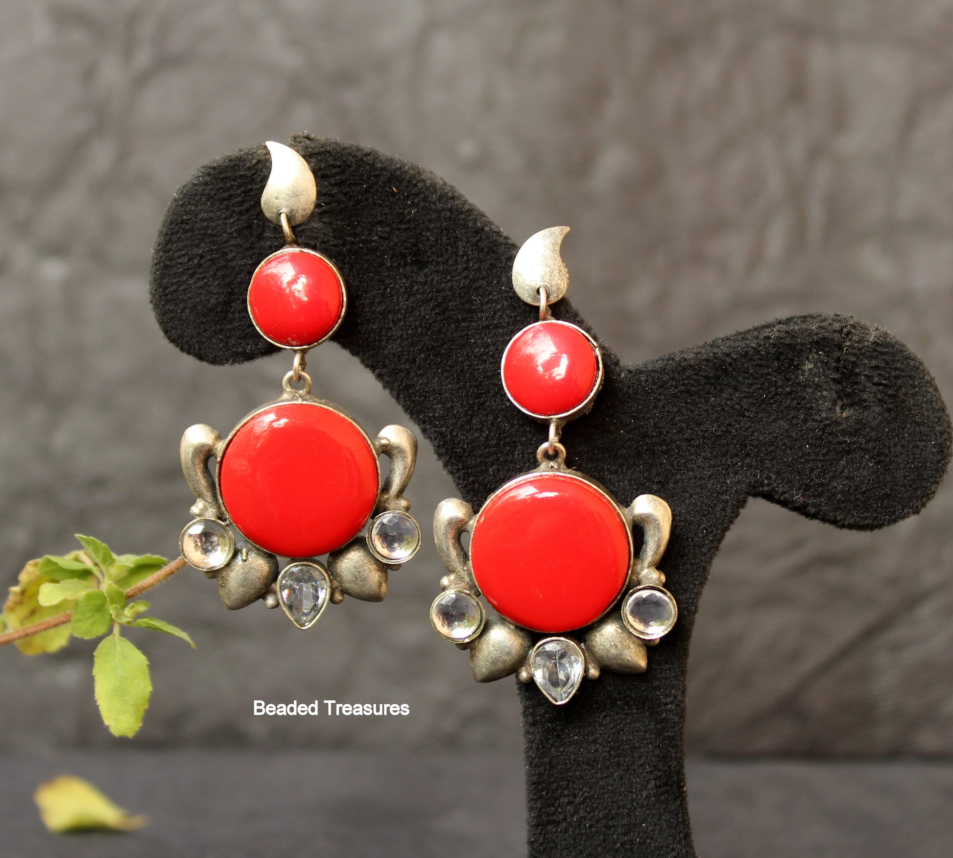 - Unique and stylish Dangle Earrings featuring vibrant red coral stones, sparkling Cubic Zirconia (CZ) accents, and a beautiful oxidized sterling silver setting, handcrafted by Beaded Treasures in Bengaluru.