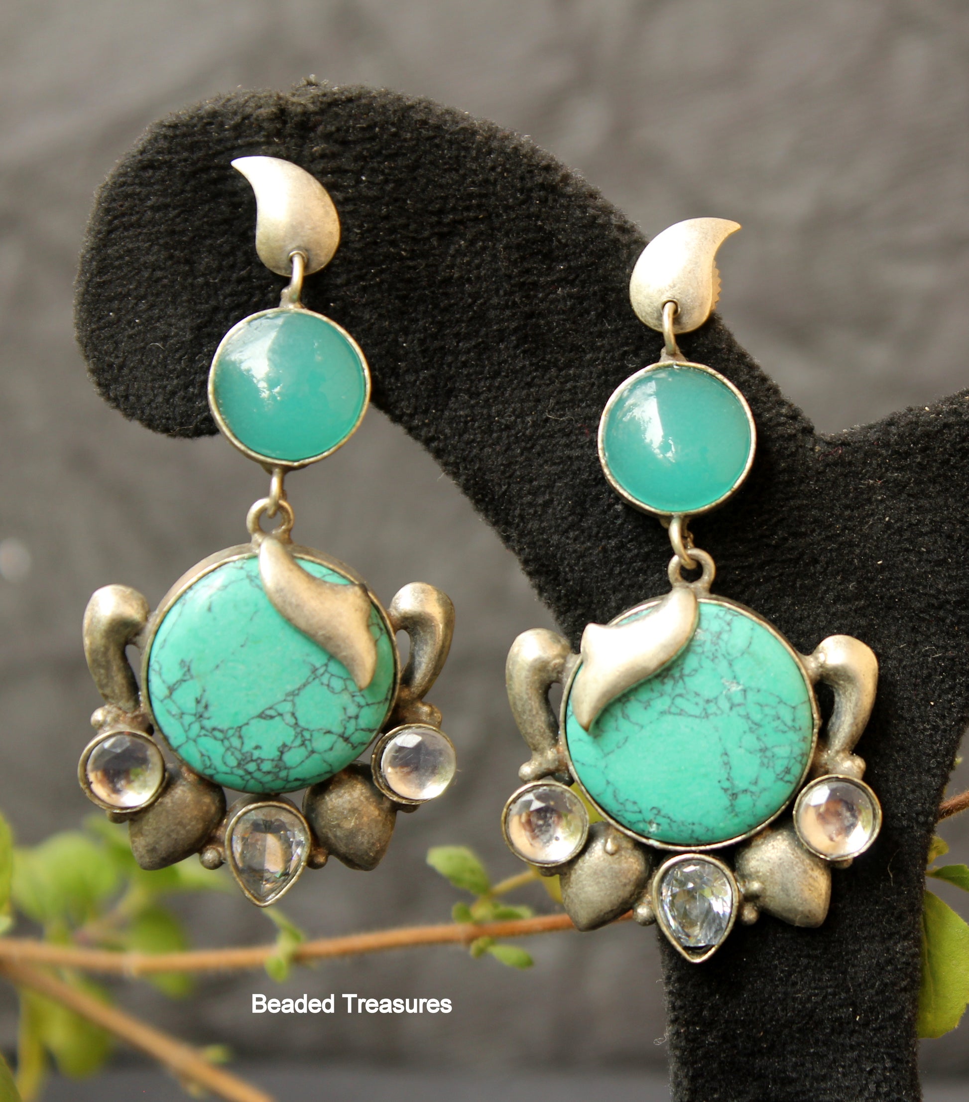 - Unique and stylish Dangle Earrings featuring genuine or simulated turquoise stones, sparkling Cubic Zirconia (CZ) accents, and a beautiful oxidized sterling silver setting, handcrafted by Beaded Treasures in Bengaluru.