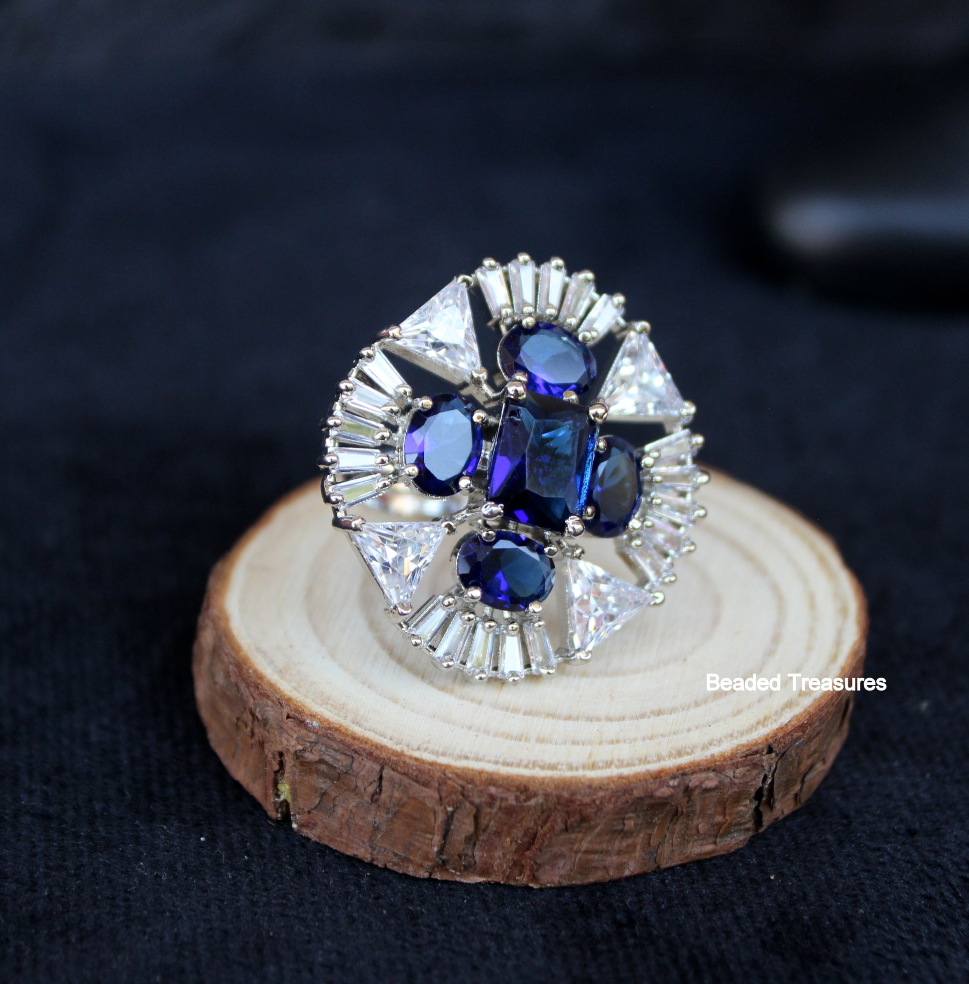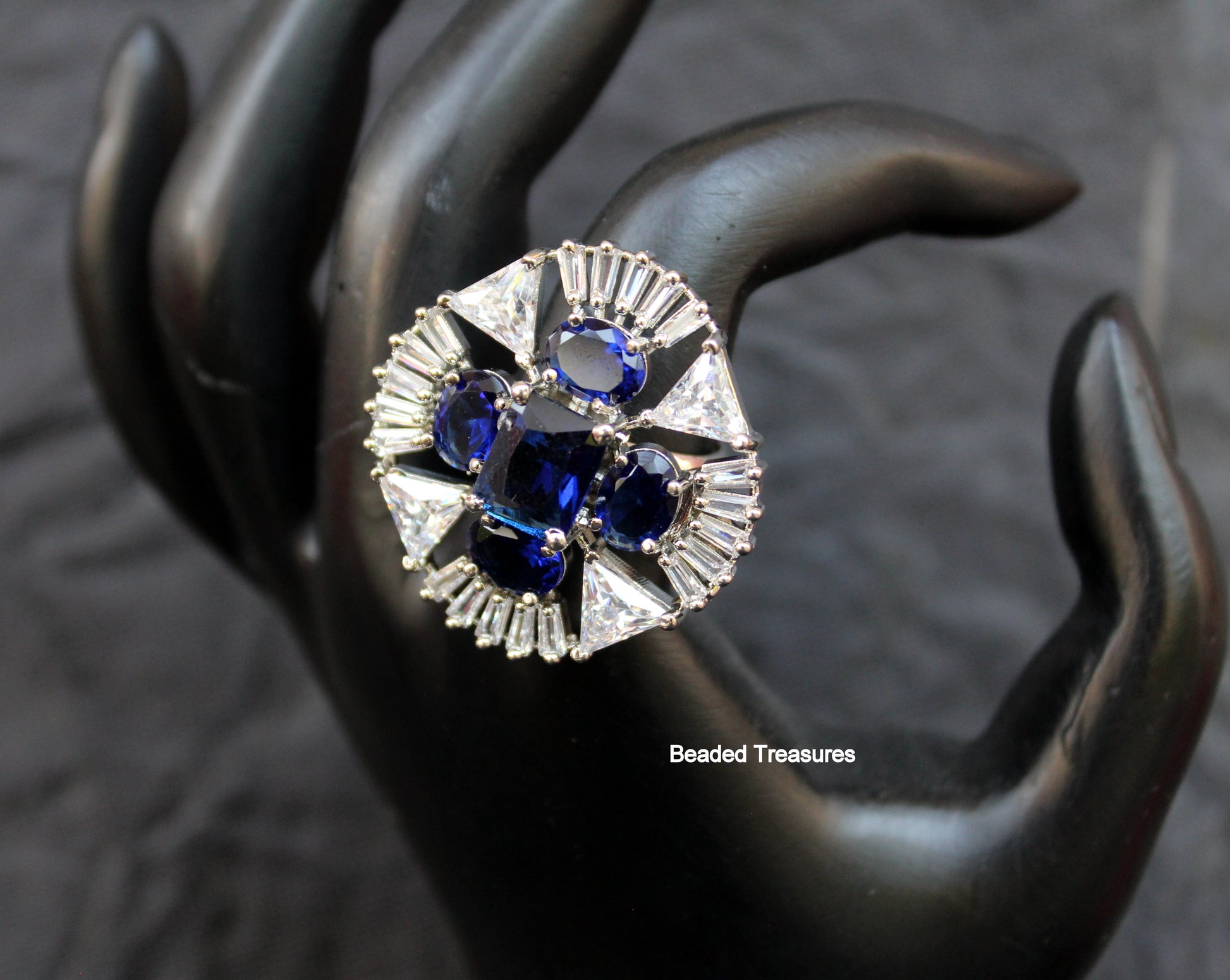 - Bold Rhodium Plated Finger Ring featuring a captivating arrangement of vibrant blue and sparkling clear American Diamond (AD) stones, handcrafted by Beaded Treasures in Bengaluru.