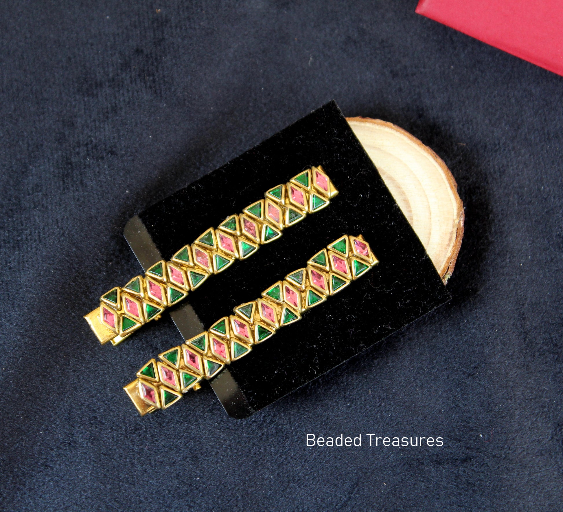 - Vibrant Triangle Pink and Green Stone Hair Clips, handcrafted by Beaded Treasures in Bengaluru.