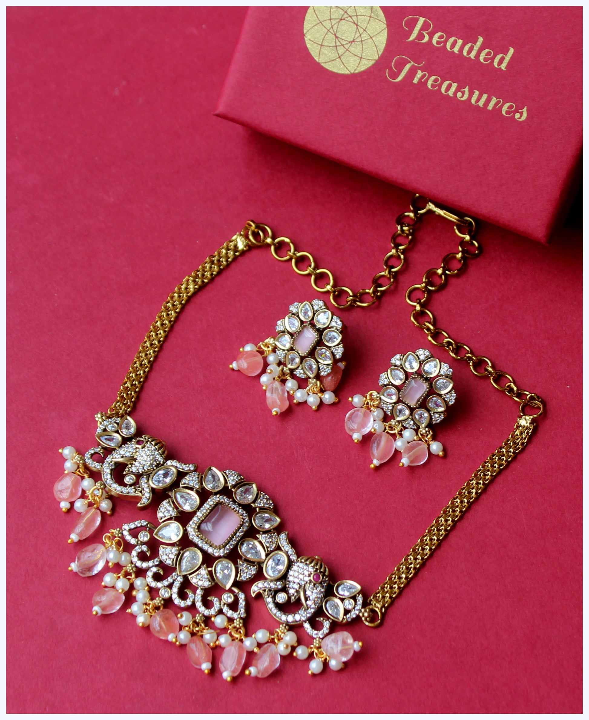 - Elegant Victorian Choker Set with Pink Stones, crafted by Beaded Treasures in Bengaluru.