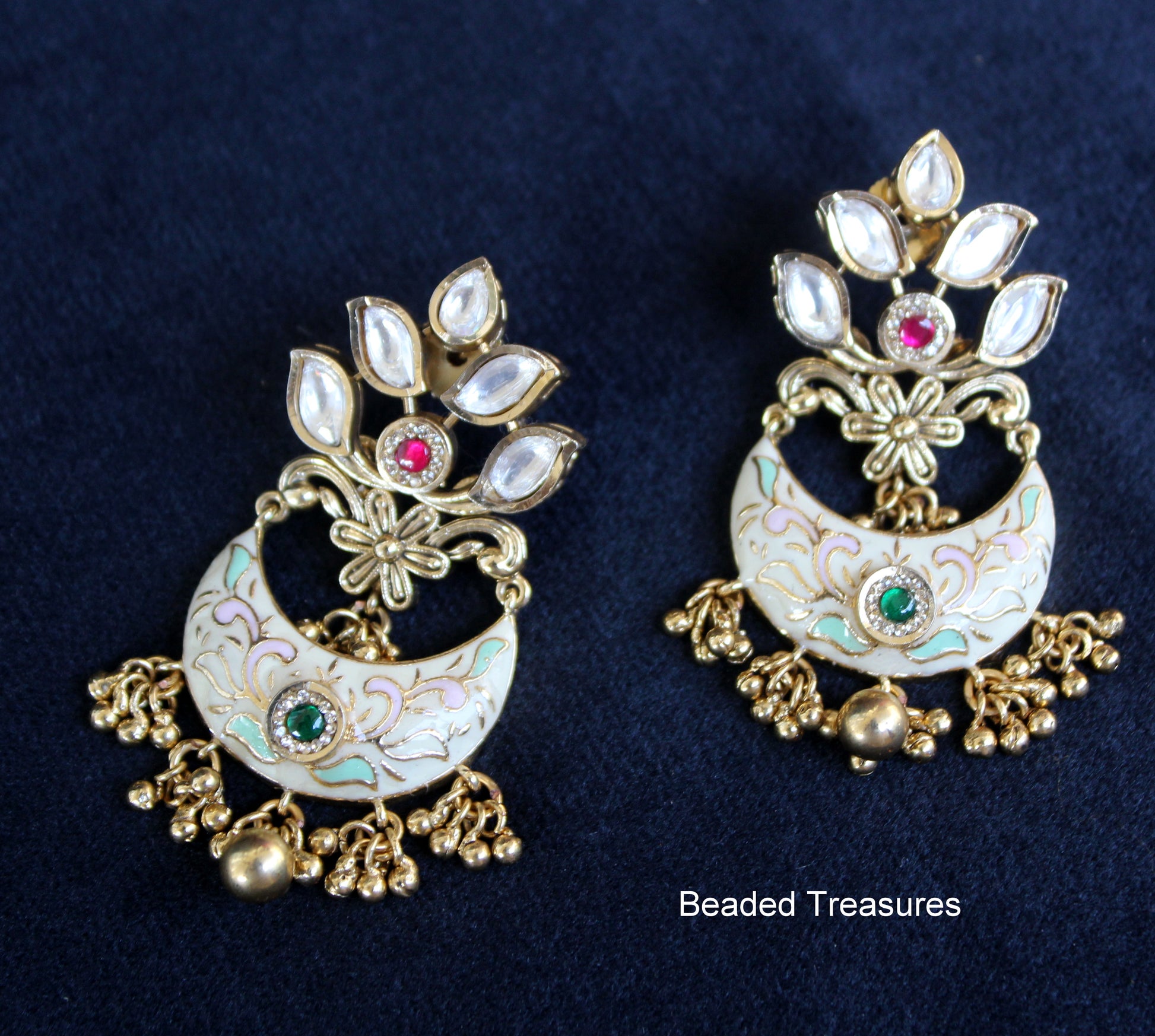 - Exquisite White & Pink Ethnic Meenakari Lotus Design Dangler Earrings, handcrafted by Beaded Treasures in Bengaluru.